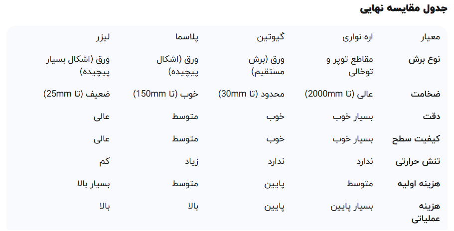 - محدودیت ضخامت: برای برش ورقها و مقاطع ضخیم (بالاتر از حدود ۲۰-۳۰ میلیمتر) مناسب نیست.
